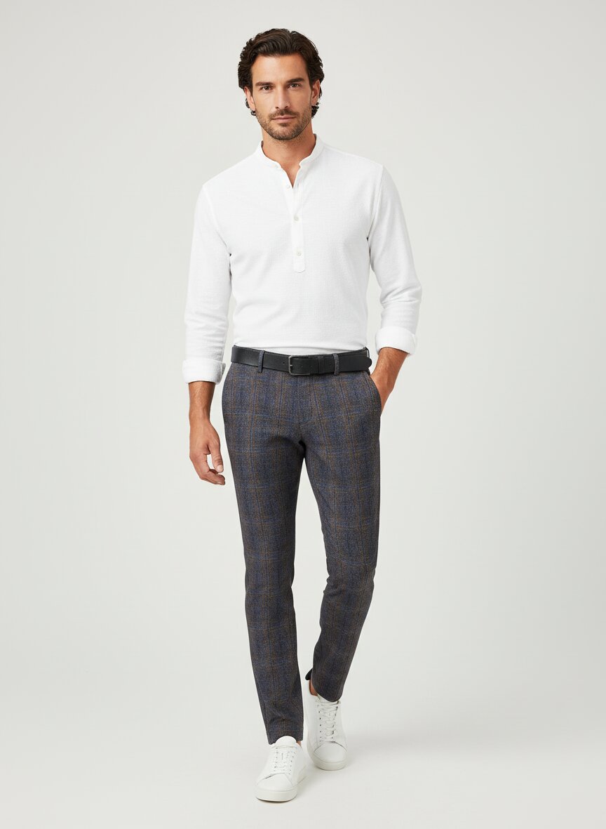 Das braun-lila Glencheck-Muster zeigt sich in einer abstrakten, zeitgemäßen Interpretation des Klassikers und verleiht dieser Chino sofort Charakter. Der hochwertige Jersey-Mix aus Polyester, Viskose und Elasthan fühlt sich geschmeidig an und bietet durch seine Dehnbarkeit uneingeschränkte Bewegungsfreiheit – ideal für lange Tage im Büro oder unterwegs. Die Slim-Fit-Passform sitzt körpernah ohne einzuengen und verleiht eine moderne, schlanke Silhouette, die gleichzeitig komfortabel bleibt. Seitliche Einschubtaschen und gekn öpfte Gesäßtaschen runden das durchdachte Design ab und bieten praktische Funktionalität.