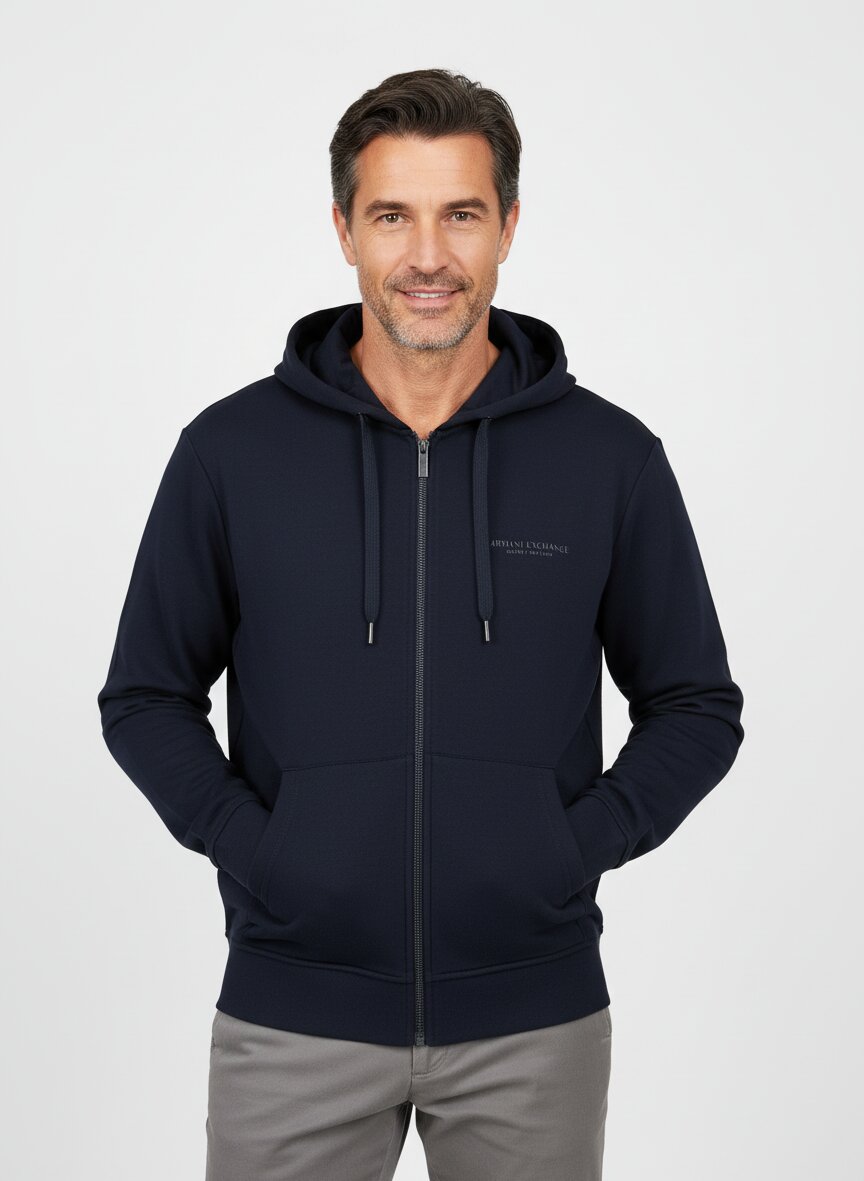 Der durchgehende Zwei-Wege-Zipper macht diese Kapuzenjacke besonders flexibel – ob offen über einem T-Shirt oder komplett geschlossen für extra Wärmeschutz. Das Obermaterial besteht aus 96 % Baumwolle mit 4 % Elasthan, wodurch die Jacke angenehm dehnbar bleibt und ihre Form über lange Zeit bewahrt. Das klassische Marineblau passt zu nahezu jedem Casual-Look und wirkt dabei zeitlos elegant statt trendig. Seitliche Einschubtaschen bieten praktischen Stauraum für Alltag und Freizeit. Armani Exchange überträgt die minimalistische Designphilosophie des Mailänder Hauses in moderne Streetwear – funktional, präzise geschnitten und ohne unnötige Details.Unser Tipp: Kombinieren Sie die Jacke mit einer hellen Chino und weißen Sneakern für einen frischen Urban-Look, der vom Büro bis zum Wochenende funktioniert.