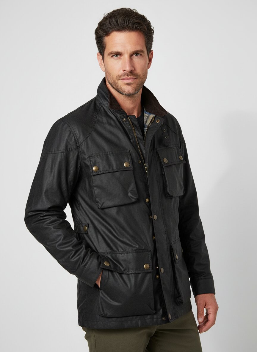 Gewachste Baumwolle in tiefem Schwarz mit vier aufgesetzten Taschen
