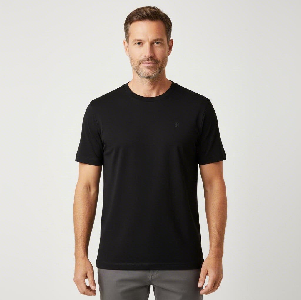 Das T-Shirt Ryan besticht durch sein tiefes, gleichmäßiges Schwarz und den schlichten Rundhals-Ausschnitt, der zeitlose Eleganz ausstrahlt. Die mercerisierte Baumwolle schmiegt sich weich an die Haut, behält ihre Farbintensität über viele Wäschen hinweg und trocknet schneller als konventionelle Baumwolle. Mit seiner geraden Silhouette und dem lockeren Sitz funktioniert das Shirt mühelos im Alltag – ob zur Chino, zum Anzug oder unter einem Blouson. Die europäische Verarbeitung garantiert präzise Nähte und eine stabile Formbeständigkeit, die auch nach intensiver Nutzung bestehen bleibt. BOGNER verbindet alpine Handwerkstradition mit modernem Lifestyle-Denken – dieser Klassiker ist das Fundament für jeden gut sortierten Kleiderschrank.Unser Tipp: Kombinieren Sie das Ryan T-Shirt mit einer hellgrauen Leinenhose und weißen Sneakern für einen mühelosen Sommer-Look, oder schichten Sie es unter einem Leinen-Hemd für urbane Leichtigkeit.