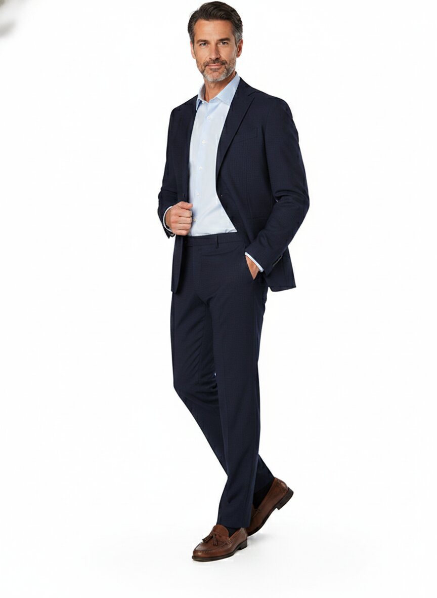 Dunkelblauer Travel-Anzug aus Woll-Stretch-Mix in semitrasparent perforierter Optik