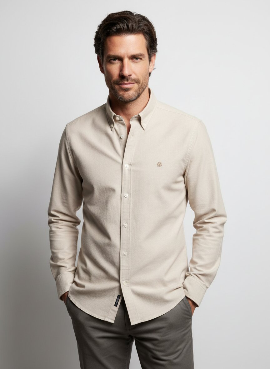 Beige meliertes Oxford-Hemd mit klassischem Button-Down-Kragen