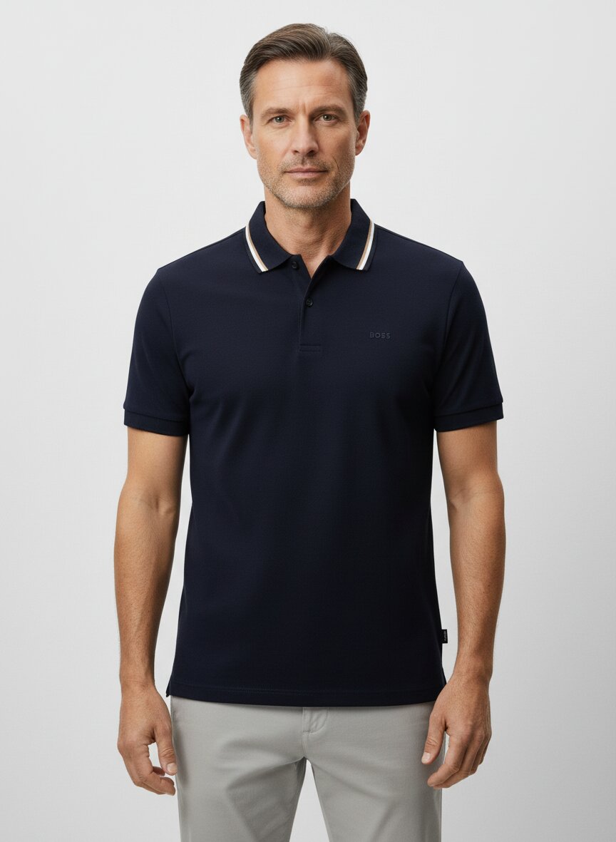 Das Polo-Shirt Penrose besticht durch seine reine Baumwolle in hochwertiger Jersey-Qualität, die eine samtweiche Haptik mit natürlicher Atmungsaktivität verbindet. Der Slim-Fit-Schnitt folgt der Körperlinie ohne zu binden und schafft eine moderne Silhouette für Business und Freizeit gleichermaßen. Die aufwendig gearbeiteten Zierstreifen am Kragen und die Rippenbündchen an den Ärmeln unterstreichen die handwerkliche Präzision von BOSS Black. Seitenschlitze sorgen für zusätzliche Bewegungsfreiheit und verleihen dem Design eine urbane Note. BOSS Black verbindet deutsche Ingenieurskunst mit zeitgemäßer Eleganz – jedes Detail vom Schnitt bis zur Materialwahl folgt höchsten Ansprüchen.Unser Tipp: Kombinieren Sie das Polo mit einer hellgrauen Chino und weißen Ledersneakern für einen mühelosen Smart-Casual-Look, der vom Büro bis zum Wochenende passt.