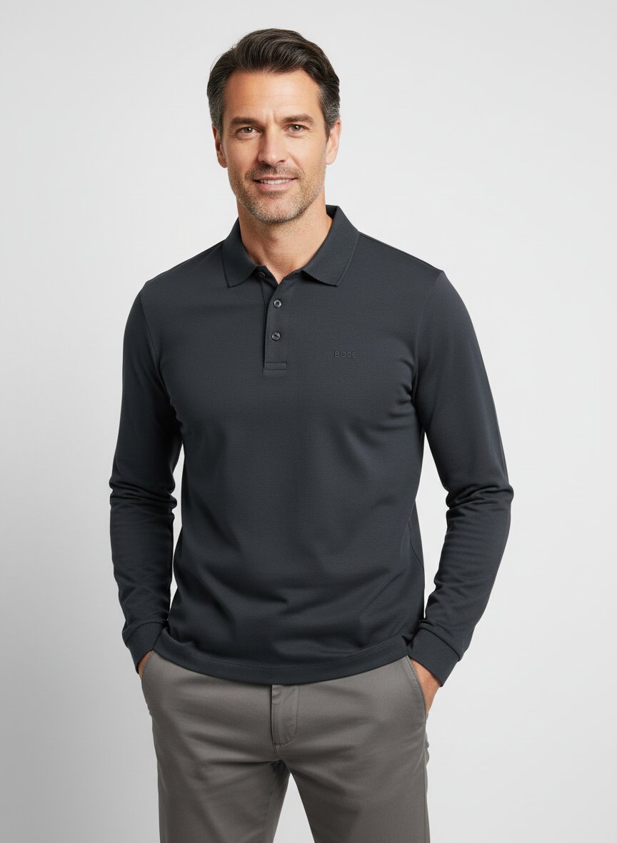 Dieses Polo-Shirt in tiefem Jägergrün besticht durch seine zeitlose Knopfleiste und die präzise Schnittführung, die BOSS Black zur Signatur gemacht hat. Der reine Baumwoll-Jersey liegt weich auf der Haut und bietet maximalen Tragekomfort durch seine atmungsaktive Struktur – ideal für lange Tage im Büro oder beim entspannten Wochenende. Die Langarmversion mit Rippenstrickbündchen an den Ärmeln schafft eine elegante Silhouette, die sowohl zu Chinos als auch zu Business-Hosen passt. Seitenschlitze sorgen für zusätzliche Bewegungsfreiheit und verleihen dem klassischen Design eine moderne Note. BOSS Black verbindet deutsche Präzision mit zeitgemäßer Eleganz – jedes Stück ist durchdacht, kein Detail dem Zufall überlassen.Unser Tipp: Kombinieren Sie das Polo mit einer hellgrauen Chinohose und Lederschnürschuhen für einen souveränen Business-Casual-Look, der auch im Sommer elegant bleibt.