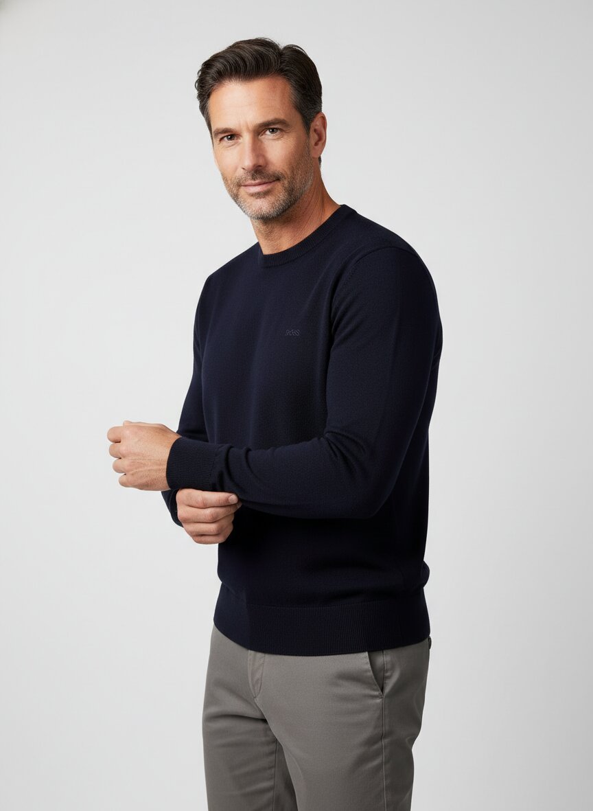 Dieser Pullover besticht durch seine schlichte Eleganz in tiefem Dunkelblau – eine Farbe, die sowohl im Business als auch in der urbanen Freizeit souverän wirkt. Die reine Baumwolle schmiegt sich angenehm an die Haut und bietet optimale Atmungsaktivität für wärmere Tage. Der klassische Rundhals-Ausschnitt und die präzise Schnittführung nach BOSS-Standard machen ihn zur verlässlichen Basis für vielfältige Kombinationen. Mit einer Rückenlänge von etwa 66 cm bei Größe M sitzt der Pullover in perfekter Proportion – weder zu lang noch zu kurz. BOSS Black verbindet deutsche Ingenieurskunst mit moderner Eleganz: Jedes Detail ist durchdacht, jede Naht sitzt präzise.Unser Tipp: Kombinieren Sie den Pullover mit einer hellgrauen Chino und weißen Sneakern für einen mühelosen Smart-Casual-Look, oder tragen Sie ihn unter einem Blazer für subtile Business-Eleganz.