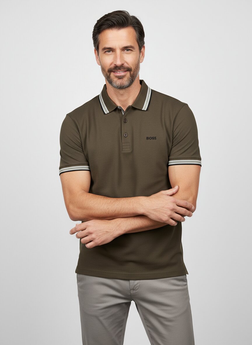 Dieses Polo-Shirt besticht durch feine schwarze Streifen an der Knopfleiste und den Ärmelbündchen, die dem dunkelgrünen Grundton eine sportive Struktur verleihen. Das Baumwoll-Piqué liegt angenehm auf der Haut, atmet zuverlässig und behält seine Form über viele Wäschen hinweg. Der Regular Fit sitzt entspannt, ohne zu binden – ideal für Alltag und Freizeit gleichermaßen. Kurzarm, klassischer Kragen und durchgehende Knopfleiste machen das Modell Paddy zu einem vielseitigen Begleiter. BOSS Green verbindet Golfwear-Erbe mit urbaner Funktionalität: Nachhaltigkeit und Qualität stehen dabei nicht im Widerspruch zu Stil und Alltagstauglichkeit.Unser Tipp: Kombinieren Sie das Polo zu einer hellen Chino und weißen Sneakern für einen mühelosen Smart-Casual-Look – perfekt für Wochenende und entspannte Bürotage.