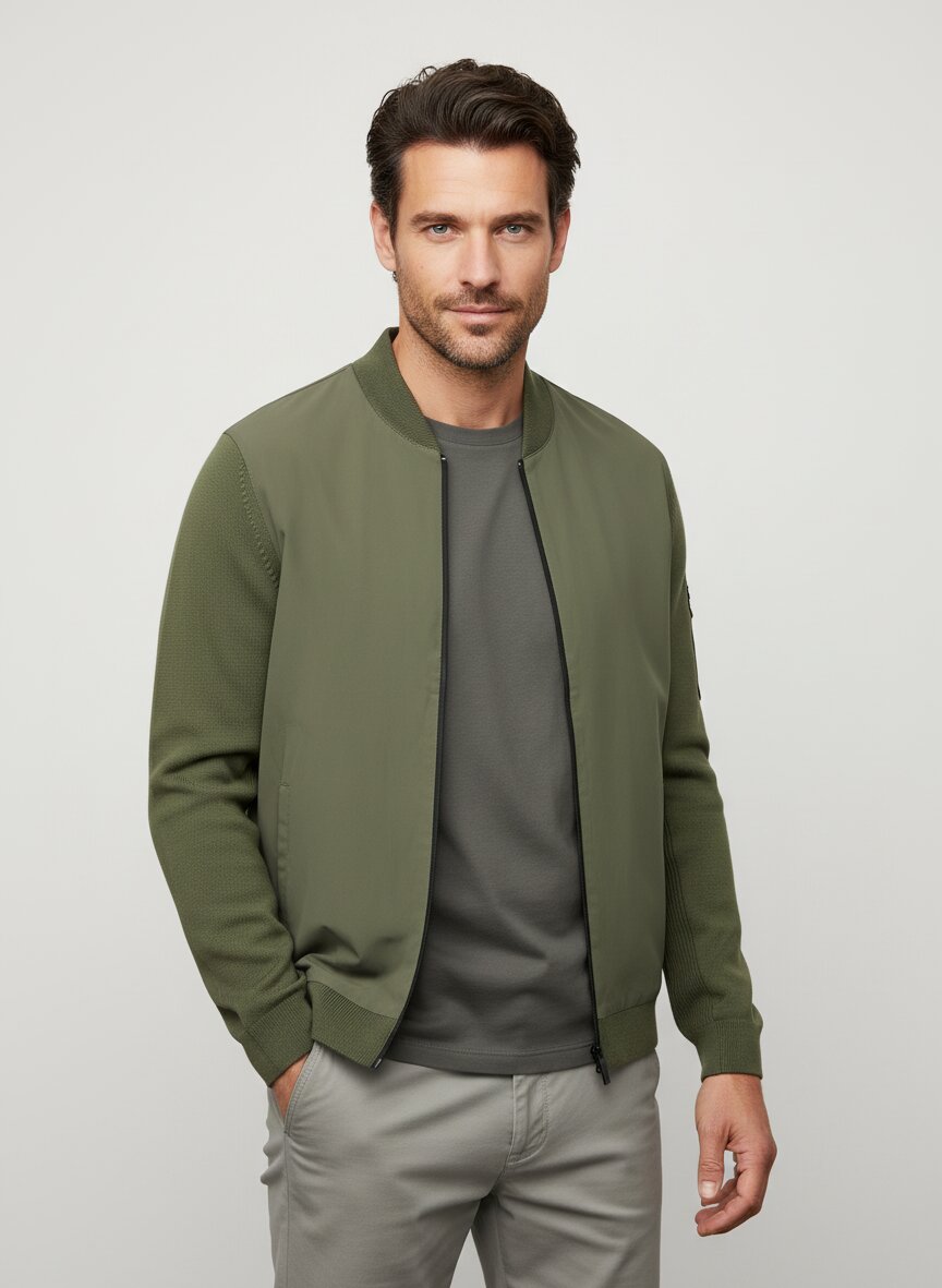 Grüne Sweatjacke mit Schurwolle und technischem Materialmix