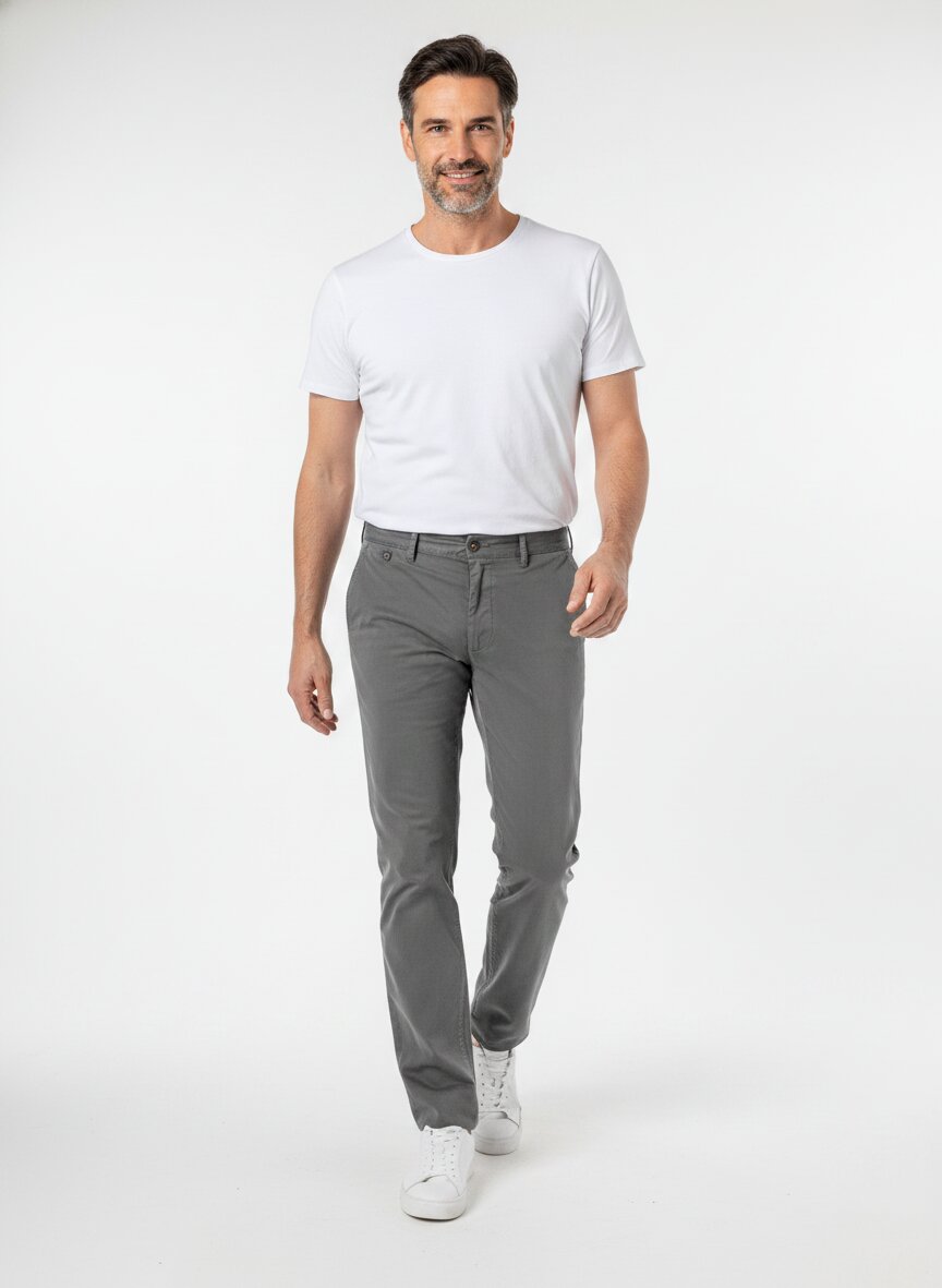 Die vielseitige graue Chino eignet sich perfekt für Business-Casual-Looks und entspannte Wochenend-Outfits. Kombinieren Sie sie mit einem weißen Oxford-Hemd und braunen Ledersneakern für einen stilvoll-lässigen Look.
