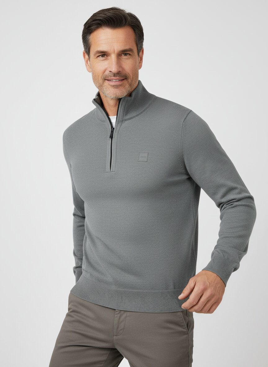 Der Kanobix besticht durch sein gedämpftes Dunkelgraugrün – eine Farbnuance, die zwischen Waldton und urbanem Grau schwebt und klassische Basics neu interpretiert. Das Materialmix aus 95 % Baumwolle und 5 % Kaschmir verleiht dem Troyer eine samtig-weiche Haptik, die Tragekomfort mit dezenter Luxus-Note verbindet. Der charakteristische Stehkragen mit durchgehendem Reißverschluss ermöglicht flexible Regulierung und macht ihn zum vielseitigen Begleiter zwischen Alltag und entspanntem Wochenende. Die klassische Troyer-Silhouette mit moderater Passform (bei Größe M: Rückenlänge ca. 69 cm, Brustweite ca. 114 cm) bietet genug Raum für lässiges Layering ohne zu bauschen. BOSS Orange verkörpert urbane Authentizität – hier trifft deutsche Handwerkstradition auf unkonventionelle Farb- und Materialwahl für kreative Individualisten, die Qualität subtil einsetzen.Unser Tipp: Kombinieren Sie den Troyer mit einer hellen Chino und weißen Sneakern für einen modernen Casual-Look, oder schichten Sie ihn über einem feinen Hemd für smarte Übergangstage.