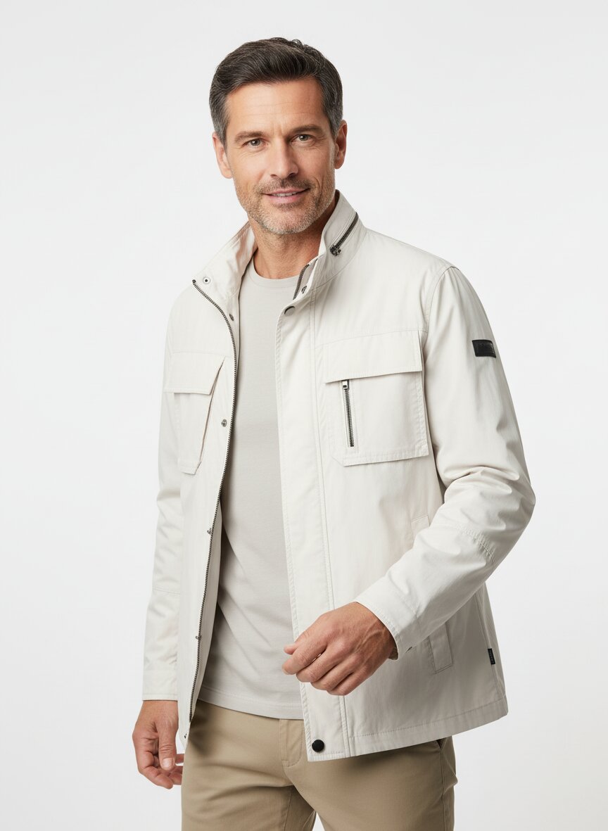 Mit Stehkragen und darin verstaubarer Kapuze, Reißverschluss, Druckknopfleiste, Brusttaschen mit geknöpfter Patte und Reißverschlusstaschen, Taille und Ärmel weitenregulierbar