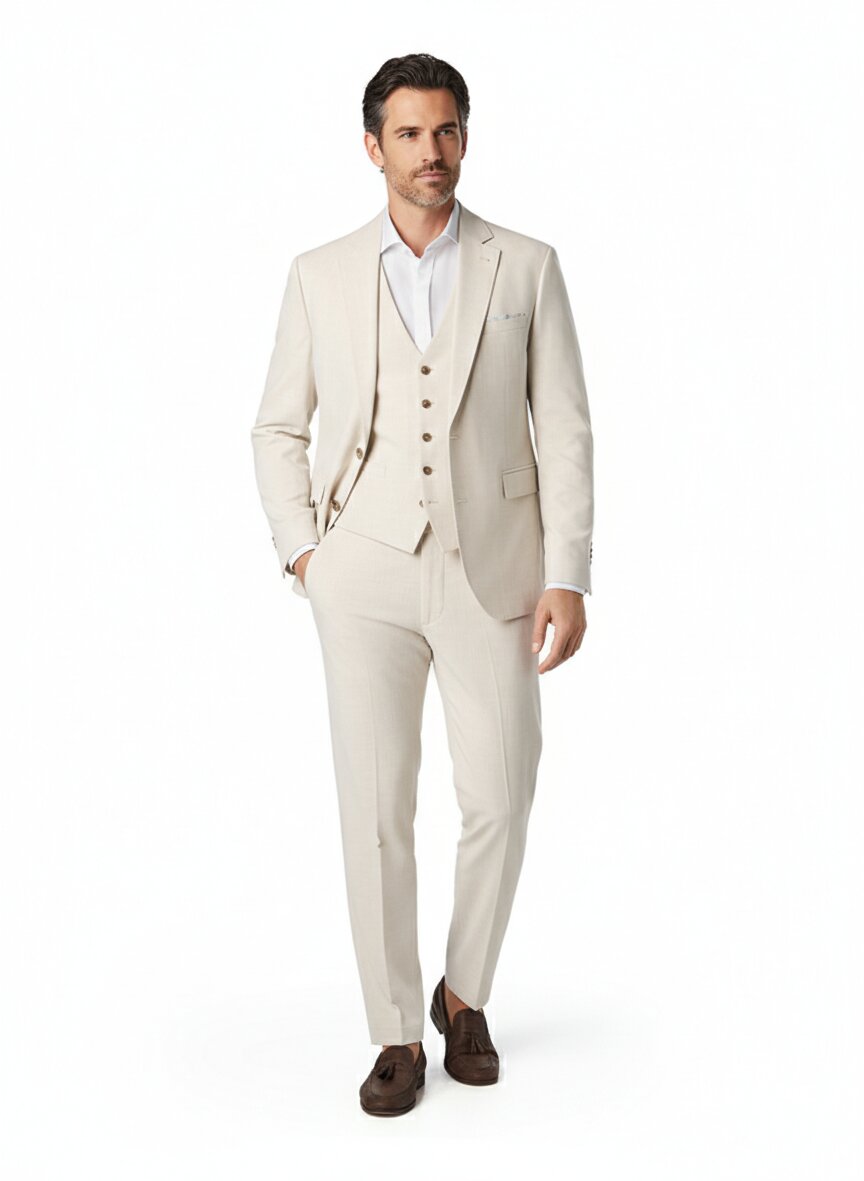 Dreiteiliger Anzug in Beigemeliert – Jersey-Komfort mit klassischer Eleganz
