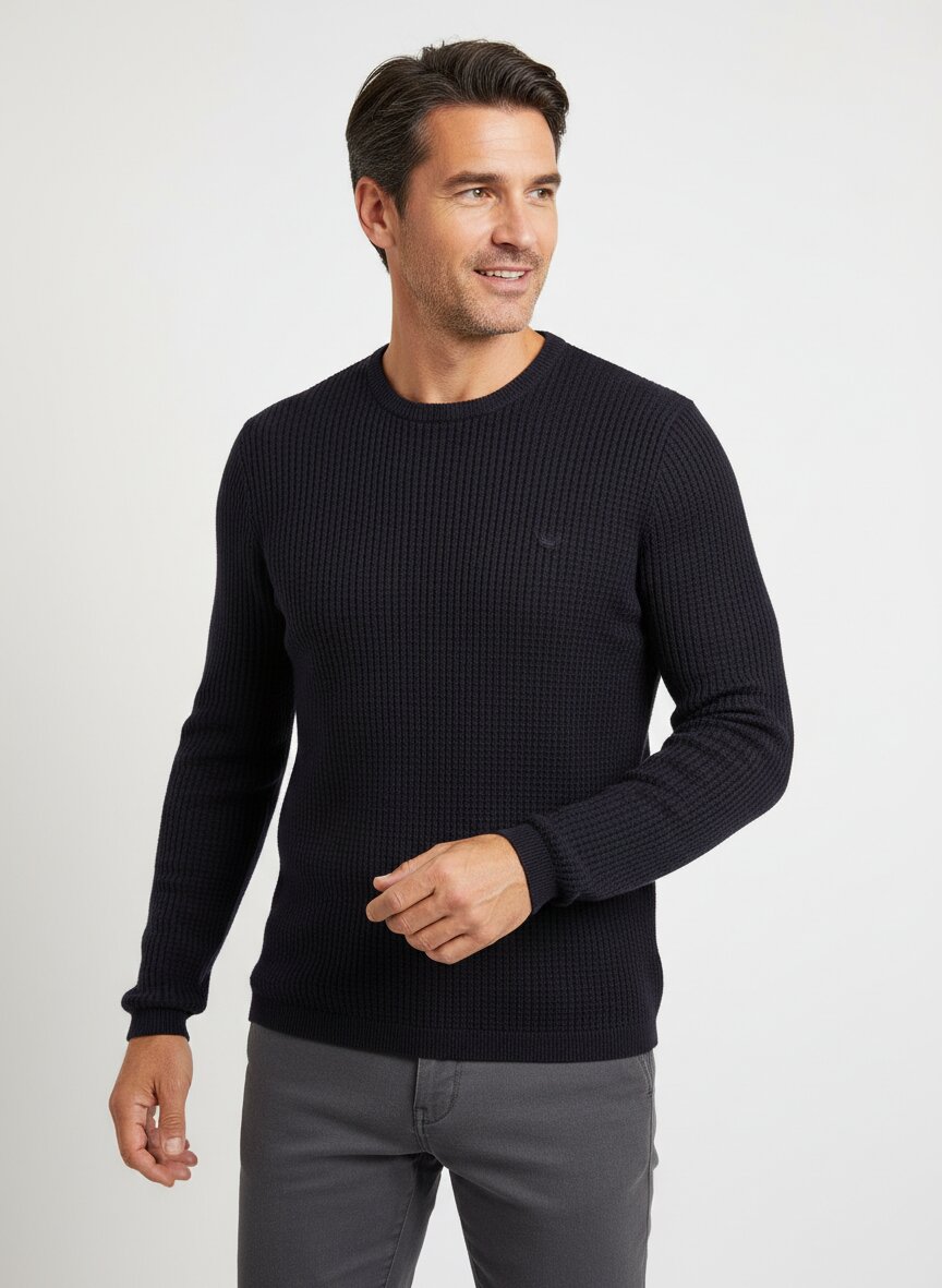 Strukturierter Woll-Mix in dunklem Navy mit modernem 3D-Strick