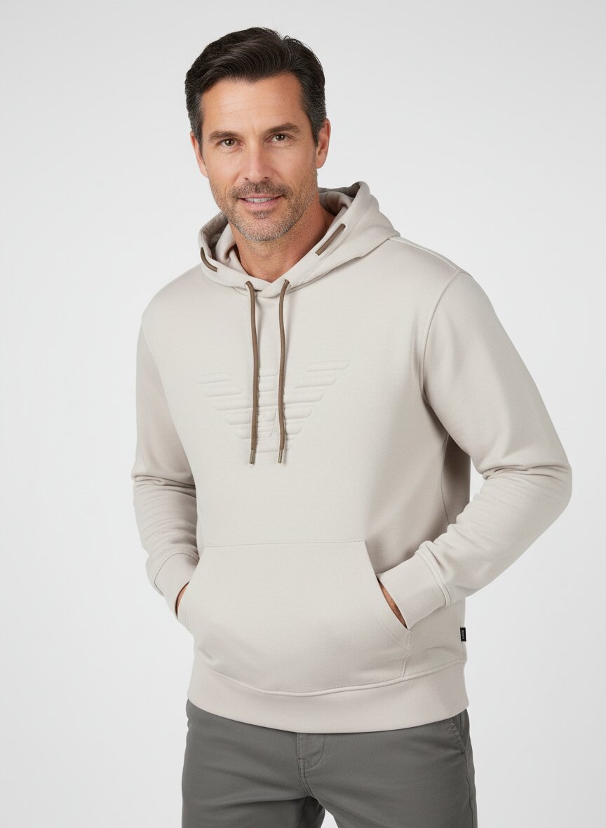 Das subtile Greige dieser Kapuzenjacke verkörpert die minimalistische Eleganz, die Emporio Armani auszeichnet – zeitlos und vielseitig kombinierbar. Der Baumwoll-Elasthan-Mix (96% Baumwolle, 4% Elasthan) bietet angenehme Bewegungsfreiheit und eine hautfreundliche Oberfläche, die auch nach häufigem Tragen ihre Form bewahrt. Die Doppelkordel und das diskrete Logo auf der Brust setzen subtile Akzente ohne Lautstärke. Mit einer Rückenlänge von etwa 64 cm bei Größe M sitzt der Hoodie präzise geschnitten zwischen sportiv und elegant – ideal für den urbanen Alltag oder entspannte Wochenenden. Seit 1981 verbindet Emporio Armani italienisches Design-Erbe mit moderner Zugänglichkeit: klare Schnitte, schlichte Eleganz und ein jugendlicher Esprit, der Stil und Haltung zeigt – ohne Kompromisse.Unser Tipp: Kombinieren Sie diesen Hoodie mit einer anthrazitfarbenen Chino und weißen Sneakern für einen zeitgemäßen Casual-Look, der auch im Büro besticht.