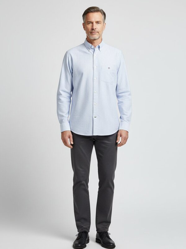 Das Streifenmuster in Hellblau und Weiß verleiht diesem Oxford-Hemd zeitlose Eleganz mit sportlichem Charakter. Die 100% Baumwolle in Oxford-Qualität bietet angenehme Atmungsaktivität und entwickelt mit der Zeit einen authentischen, gelebten Look. Der Button-Down-Kragen und die Brusttasche unterstreichen den klassischen Campus-Stil, während die weitenverstellbare Sportmanschette maximale Flexibilität im Alltag ermöglicht. Die Rückenfalte sorgt für zusätzliche Bewegungsfreiheit und verhindert Spannungen beim Sitzen – ein durchdachtes Detail für den modernen Träger. GANT verkörpert seit 1949 die Preppy-Tradition der amerikanischen Ostküste: funktional, präzise geschnitten und in bewährten Materialien gefertigt, ohne dabei modische Trends zu verfolgen.Unser Tipp: Kombinieren Sie das Hemd mit einer dunklen Chino und Loafern für einen mühelosen Smart-Casual-Look, der sowohl im Büro als auch beim Wochenendbrunch überzeugt.