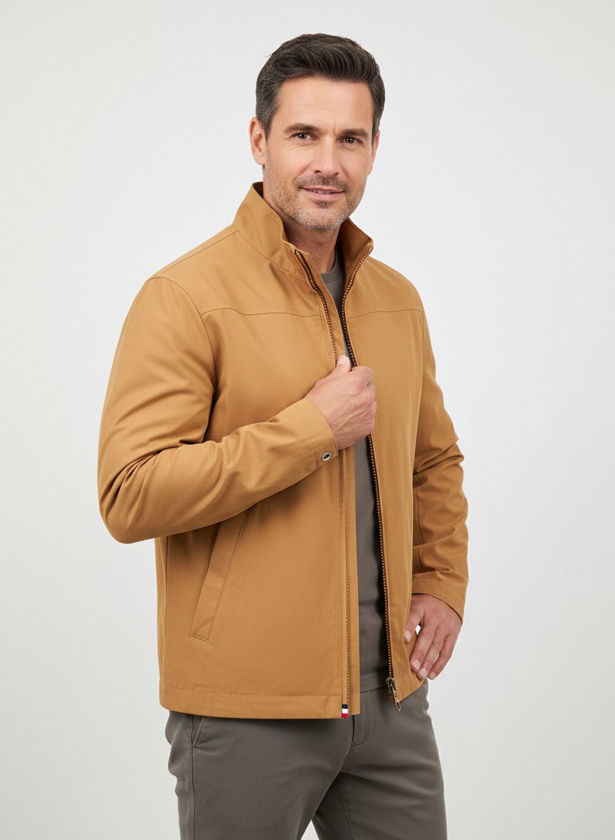Der Mix aus 60 Prozent Baumwolle und 40 Prozent Polyamid schafft ein robustes, atmungsaktives Gewebe, das sich angenehm geschmeidig anfühlt und dabei strapazierfähig bleibt. Belüftungsösen und der elastische Saumabschluss sorgen für optimale Luftzirkulation an wärmeren Tagen – ideal für Übergangsjahreszeiten. Der markante Stehkragen mit kontrastiertem Rippenstrick-Futter prägt den sportlich-eleganten Charakter, während verdeckte Seitentaschen mit Reißverschluss Funktionalität ohne Umschweife bieten. Druckknöpfe an den Ärmeln ermöglichen eine individuelle Weitenregulierung, was den Blouson flexibel für verschiedene Schichten einsetzbar macht. HECHTER PARIS verbindet seit 1962 französische Eleganz mit praktischer Tragbarkeit – dieser Blouson verkörpert genau diesen Anspruch: Understatement statt Lautstärke, Modern Fit statt Überfluss.Unser Tipp: Kombinieren Sie den braunen Blouson mit einer cremefarbenen Baumwollhose und weißen Sneakern für einen zeitlosen Urban-Look, der von Frühjahr bis Sommer funktioniert.