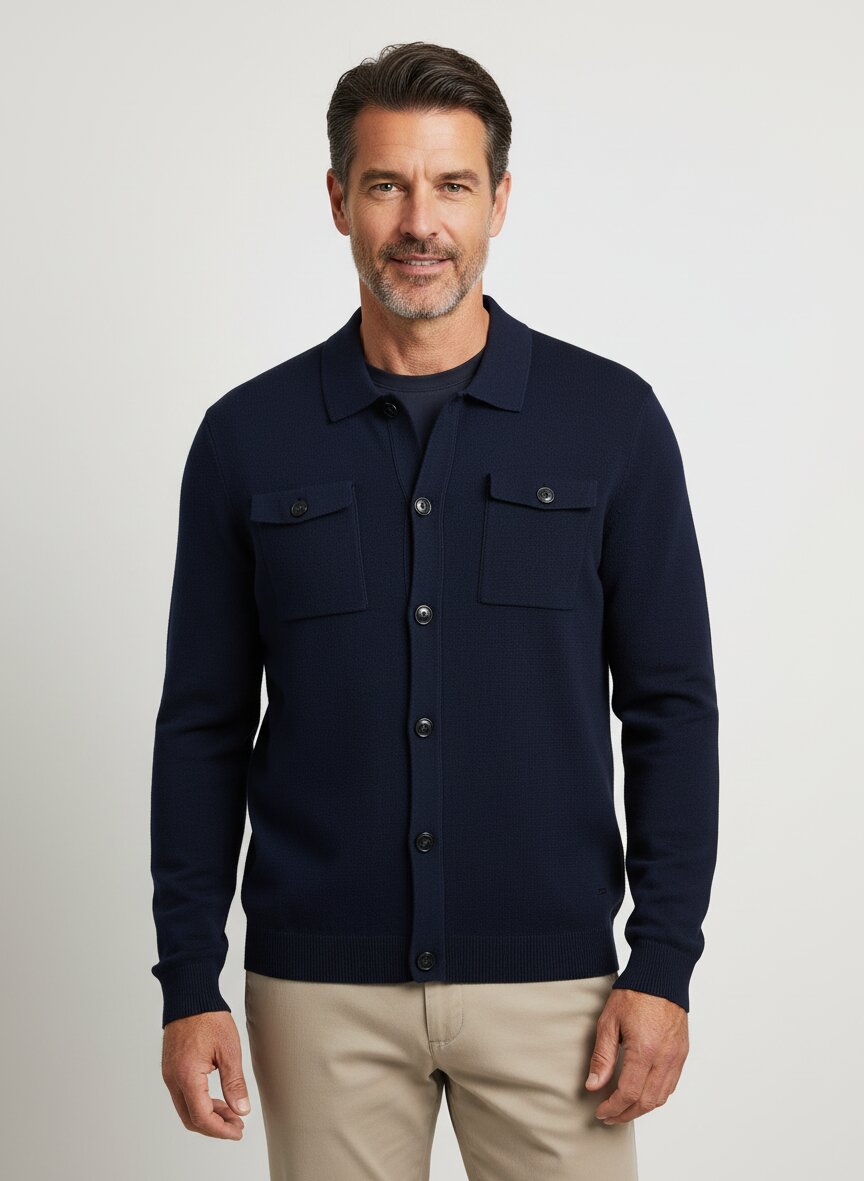 Das tiefe Dunkelblau dieses Cardigans wirkt zeitlos elegant und lässt sich mühelos in jeden Kleiderschrank integrieren. Die mercerisierte Baumwolle besticht durch ihren seidigen Glanz und ihre außergewöhnliche Geschmeidigkeit – ein Material, das durch spezielle Behandlung noch strapazierfähiger und formbeständiger wird. Der klassische Umlegekragen und die durchgehende Knopfleiste machen ihn zum vielseitigen Layering-Partner für Business wie für Freizeit. Praktische Brusttaschen mit geknöpfter Patte runden die durchdachte Ausstattung ab. JOOP! interpretiert den Cardigan als urbanes Klassiker-Piece – präzise geschnitten, hochwertig verarbeitet und unaufdringlich markant.Unser Tipp: Tragen Sie den Cardigan offen über einem weißen Hemd und kombinieren Sie ihn mit einer anthrazitfarbenen Chino für einen eleganten Business-Casual-Look, der auch in der wärmeren Jahreszeit luftig wirkt.