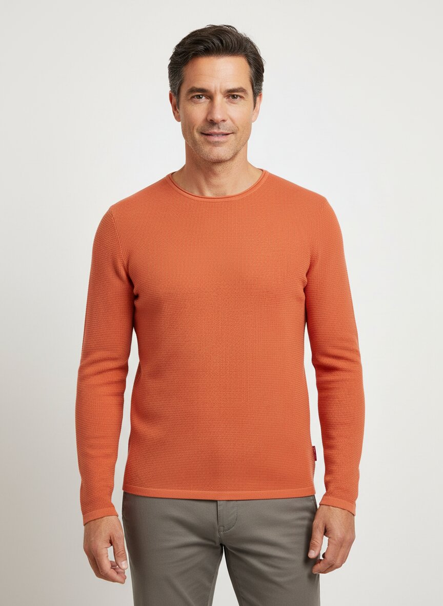Das intensive Orange dieses Pullovers setzt ein kraftvolles Statement – die strukturierte Strickoberfläche verleiht dem Klassiker optische Tiefe und Bewegung. Die reine Baumwolle schmiegt sich angenehm an die Haut und bietet maximale Atmungsaktivität für warme Tage. Der Rundhals-Ausschnitt mit Rollkante wirkt dezent sportlich und lässt sich mühelos zu Chinos oder leichten Hosen kombinieren. Bei Größe M misst die Rückenlänge etwa 69 Zentimeter – ein präziser Schnitt, der auch beim Beugen nicht verrutscht. JOOP! verbindet deutsche Designpräzision mit urbaner Modernität: Jedes Teil ist ein durchdachtes Statement zwischen Eleganz und Alltagstauglichkeit.Unser Tipp: Kombinieren Sie den Pullover mit einer hellen Leinenhose und Loafern für einen mühelosen, sommerlichen Business-Casual-Look – das Orange bringt Energie in jeden Auftritt.