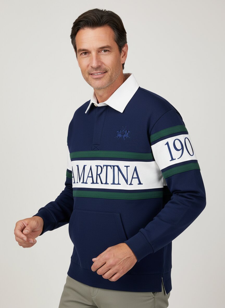 Dieses Sweatshirt verbindet die klassische Polo-Ästhetik mit moderner Sweatshirt-Lässigkeit – der Kontrast-Kragen und die subtile Logo-Stickerei auf der Brust setzen dezente Akzente. Die reine Baumwolle liegt weich auf der Haut, bietet natürliche Atmungsaktivität und behält ihre Form über viele Tragezyklen hinweg. Der Schnitt mit Polo-Kragen macht das Sweatshirt zum vielseitigen Begleiter zwischen Business-Casual und Wochenend-Outfit. Rippenstrickbündchen an Ärmeln und Saum sorgen für Halt ohne zu binden, die kontrastfarbene Knopfleiste unterstreicht die durchdachte Detailarbeit. LA MARTINA verkörpert seit fast vier Jahrzehnten die Verbindung von argentinischem Polo-Spirit mit europäischer Handwerkskunst – jedes Piece erzählt von dieser Authentizität.Unser Tipp: Kombinieren Sie das Sweatshirt mit einer hellen Chino und weißen Sneakern für einen entspannten Smart-Casual-Look, der auch im Büro überzeugt.