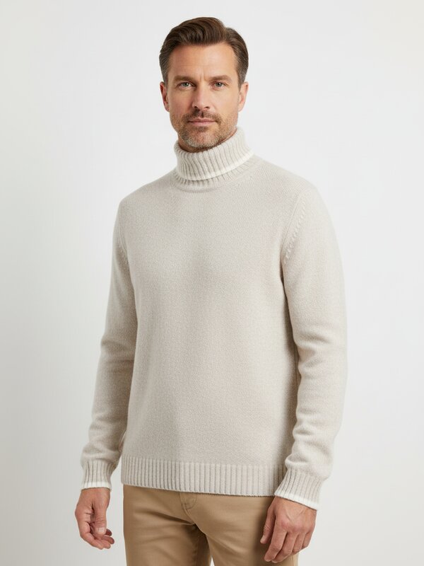 Ein klassischer Rollkragenpullover in zartem Beige mit feinen Kontraststreifen an Kragen und Ärmelbündchen – zeitlos und elegant zugleich. Die reine Schurwolle in Extrafeinheit schmiegt sich wärmend an die Haut und reguliert Feuchtigkeit natürlich, ohne zu kratzen. Der schlichte Schnitt macht ihn zum perfekten Begleiter für Business-Looks und entspannte Herbsttage gleichermaßen. Die Kontraststreifen verleihen dem klassischen Rollkragen eine subtile Designnote, die den Pullover aus der Masse hebt. MAERZ München steht seit Jahrzehnten für europäische Pullover-Handwerkskunst – reduziert, hochwertig und für Generationen gemacht.Unser Tipp: Kombinieren Sie den Pullover mit einer dunklen Wollhose und Lederschuhen für einen zeitlosen Look, der sowohl im Büro als auch beim Wochenendspaziergang überzeugt.