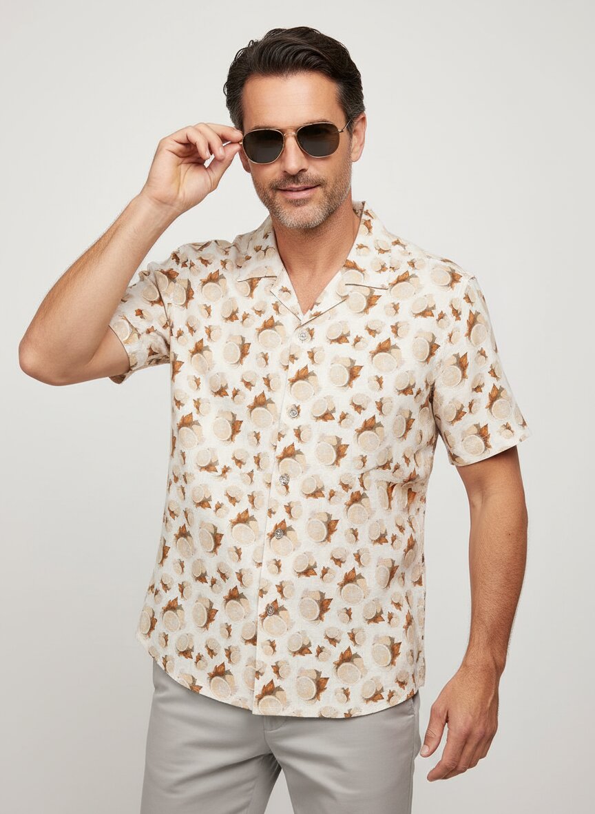 Kurzarmhemd, Reines Leines, Revers, beige gemustert