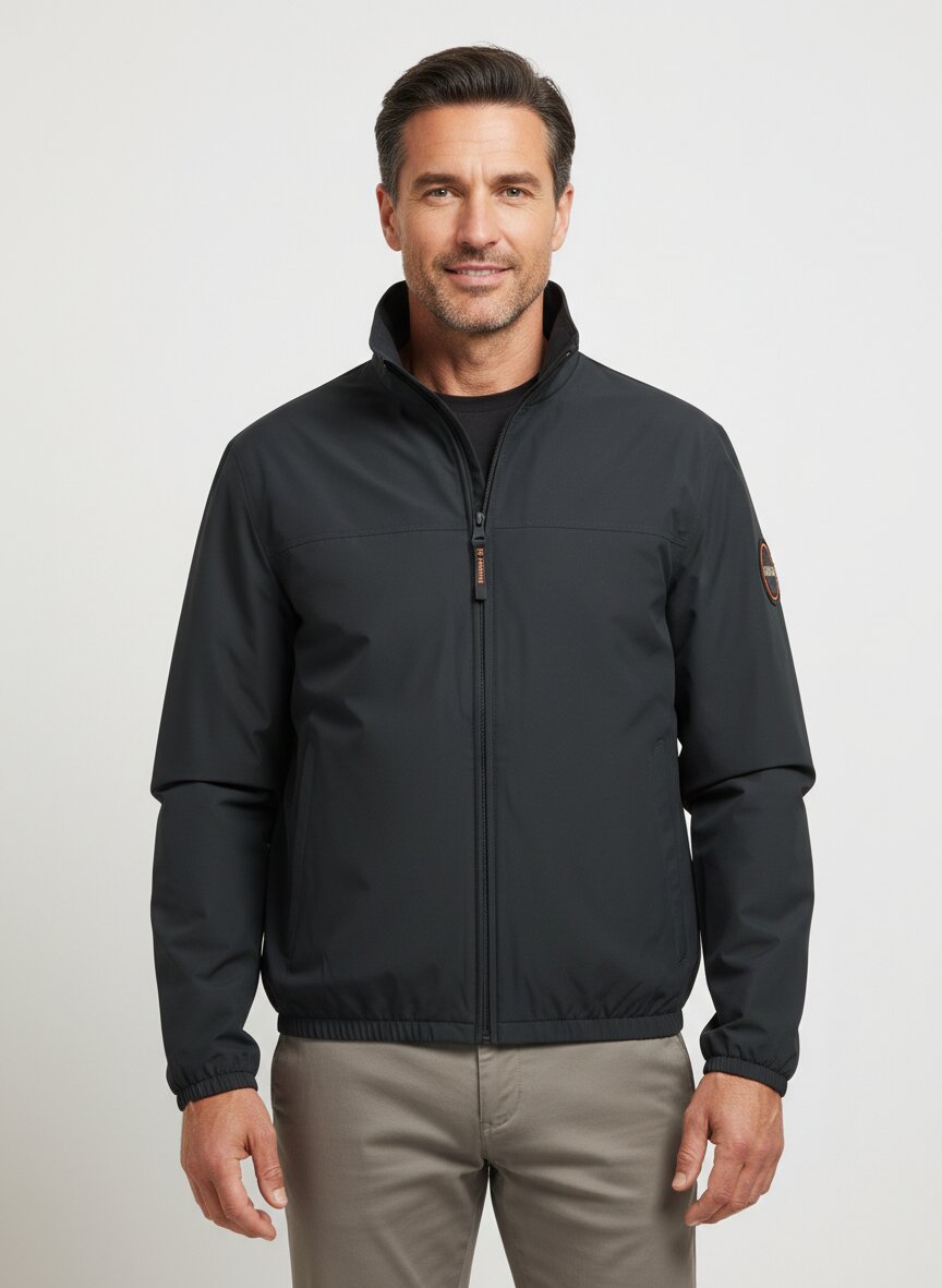Schwarze Funktionsjacke mit wasserfestem Ripstop und verstaubarer Kapuze