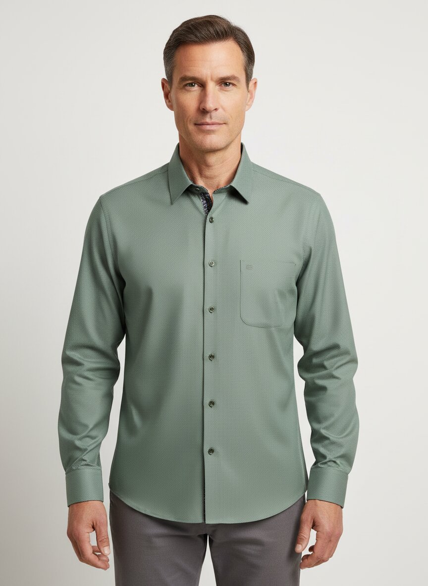 Die feine Strukturwebung in Grau-Grün schafft optische Tiefe und verleiht dem Hemd eine dezente, moderne Textur. Die reine Baumwolle liegt hautsympathisch auf der Haut und besticht durch ihre natürliche Atmungsaktivität – ideal für lange Arbeitstage und warme Jahreszeiten. Der Comfort Fit Schnitt bietet großzügige Bewegungsfreiheit, während der Kentkragen und die Brusttasche klassische Eleganz bewahren. Die weitenverstellbare Kombimanschette mit Kontrastfutter passt sich flexibel an, und die bügelfreie Ausrüstung spart Zeit im Alltag. OLYMP fertigt seit 1951 in Schwaben Hemden, die Funktionalität und zeitgemäßes Design verbinden – jedes Stück trägt die Handschrift deutscher Präzision und Innovation.Unser Tipp: Kombinieren Sie dieses Hemd mit einer anthrazitfarbenen Wollhose und braunen Lederschuhen für einen souveränen Business-Look, der auch bei Wetterwechsel im Frühjahr und Sommer überzeugt.