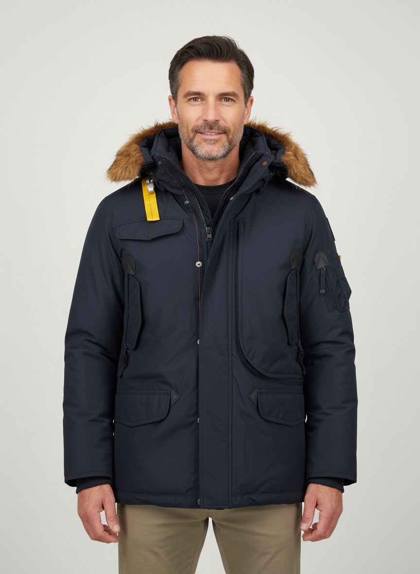 Die marineblaue Außenjacke lässt sich dank ausknöpfbarer Innenjacke und abnehmbarem Kunstpelz an der Kapuze in drei verschiedenen Varianten tragen. Das recycelte Polyamid mit MTD-Technologie schützt zuverlässig vor Wind und Wasser, während die hochwertige 90/10-Daunenfüllung für wohlige Wärme sorgt. Die durchdachte Ausstattung mit sieben Taschen, Belüftungsösen und dem markanten gelben Hakenverschluss vereint urbanen Stil mit Outdoor-Performance. Der verdeckte Zwei-Wege-Reißverschluss und die Weitenregulierung an der Taille ermöglichen flexible Anpassung an jede Wetterlage. PARAJUMPERS ehrt mit jedem Detail die Rettungsflieger Alaskas – funktionale Perfektion trifft auf italienisches Design für echte Abenteurer. Ideal für den Übergang zwischen milden Herbsttagen und eisigen Wintermonaten.Unser Tipp: Kombinieren Sie die Jacke im urbanen Look mit dunklen Jeans und robusten Boots oder sportlich mit Cargohose und Sneakern.