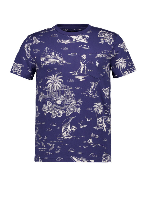 Das T-Shirt besticht durch einen tropischen Polo-Bear Print mit maritimen Motiven wie Palmen, Booten und Segelszenen auf navy-offwhite Farbkombination – perfekt für einen sommerlichen, verspielten Look.
