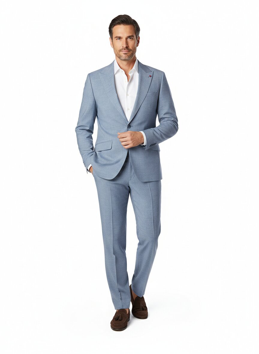 Die feine Melange in hellem Blau verleiht dem Anzug eine subtile Lebendigkeit und verbindet klassische Eleganz mit modernem Grauton – ein zeitloses Design, das vielseitig einsetzbar ist.