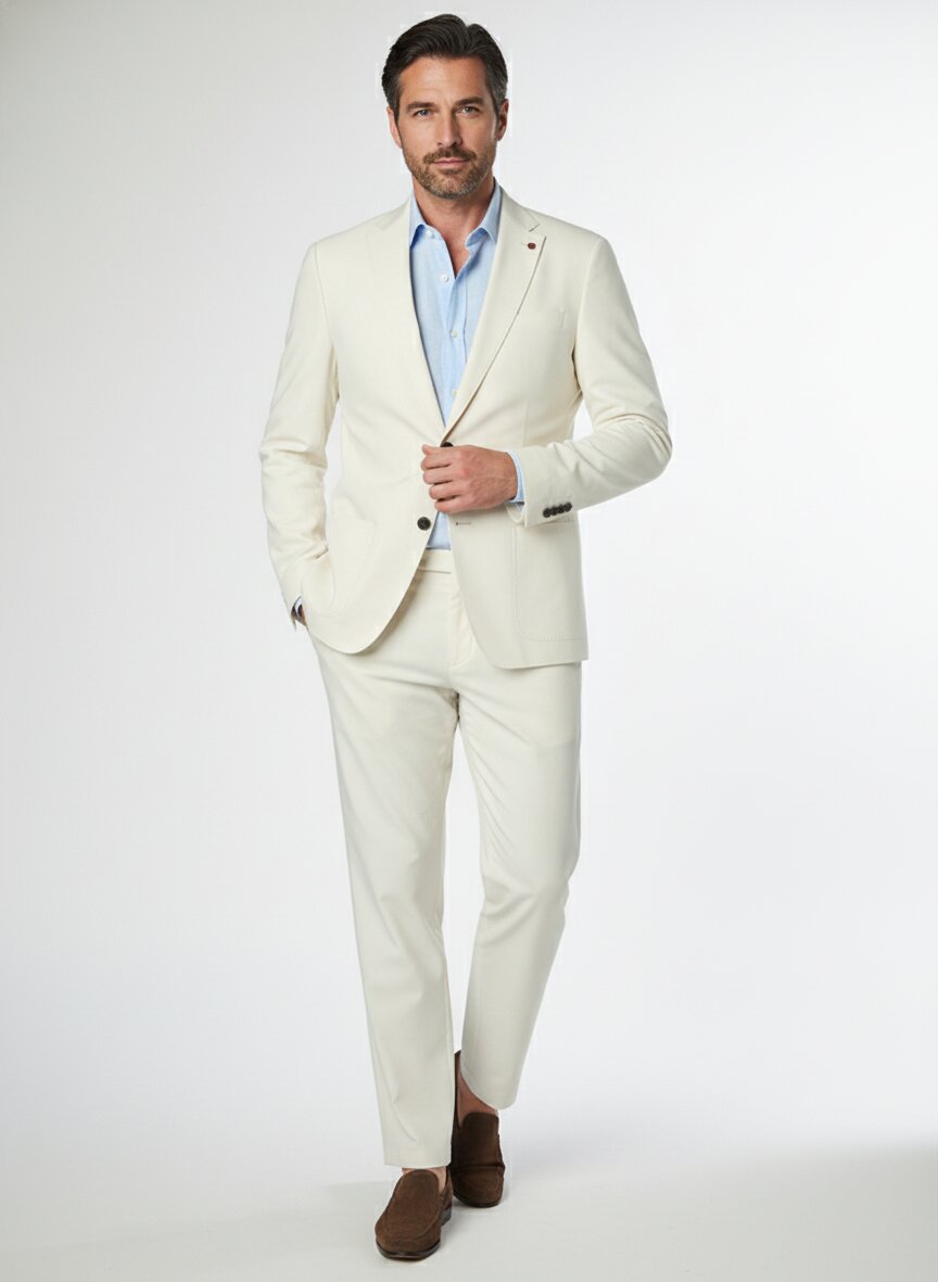Basierend auf dem klassischen Anzugschnitt verfügt der Blazer über Brusttasche und Innentaschen, die Hose über Seitentaschen. Der Blazer hat zwei Knöpfe für einen modernen Look.