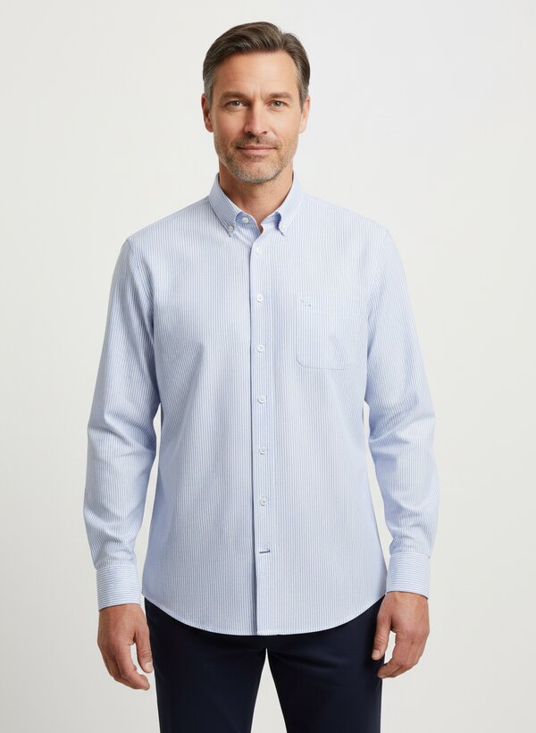 Die dezente hellblaue Streifung ist zeitlos und vielseitig kombinierbar. Sie bietet eine subtile Struktur, die das Hemd interessanter macht, ohne aufdringlich zu wirken – perfekt für professionelle und private Anlässe.