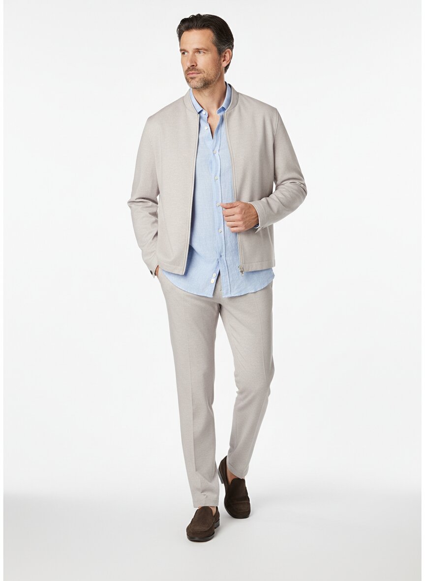 Beige melierter Jersey-Anzug mit Blouson-Sakko und elastischem Flex-Bund